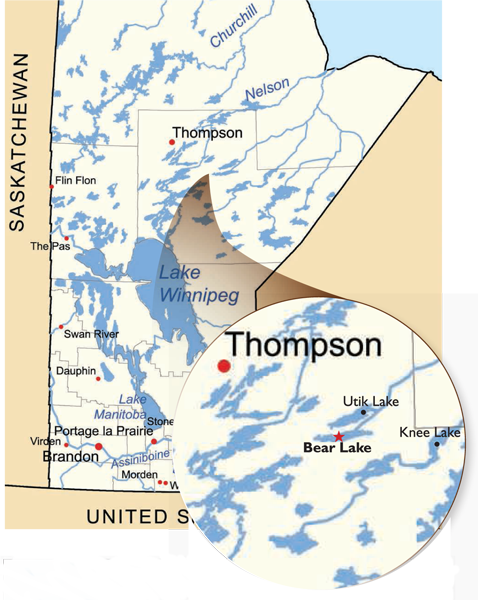 is located approximately 90 miles East-Southeast of Thompson, Manitoba, Canada,